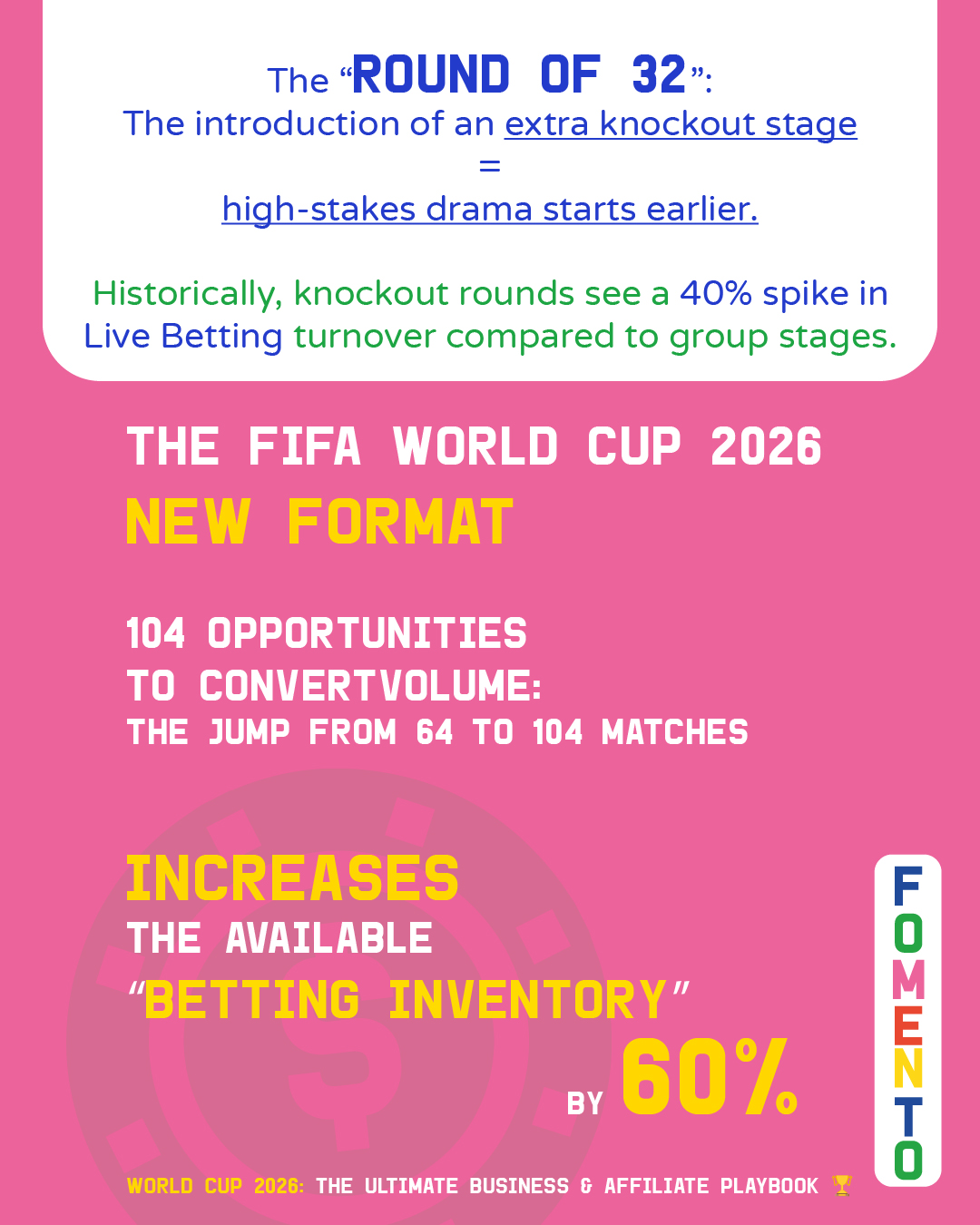 The New Format: 104 Opportunities to ConvertVolume: The jump from 64 to 104 matches increases the available “betting inventory” by 60%.Retention: A longer tournament (39 days) allows for complex CRM journeys, moving players from the “hype” phase to loyal, long-term customers.The “Round of 32”: The introduction of an extra knockout stage means high-stakes drama starts earlier. Historically, knockout rounds see a 40% spike in Live Betting turnover compared to group stages.
